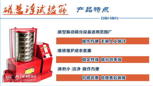 磁懸浮式試驗篩是以電磁加起振裝置作為振動源,通電后電磁裝置形成磁場,起振裝置懸浮在磁場中間,形成了上下高頻振動頻率,再通過底部托盤傳導到安放在托盤上的一套從粗到細排列的篩具上,使得實驗篩、分樣篩中的物料上下、左右往返振動及運動,使每層實驗篩、分樣篩內只留下相同粒度的物料,達到了不同粒度的分離。