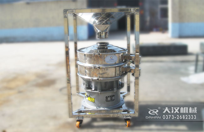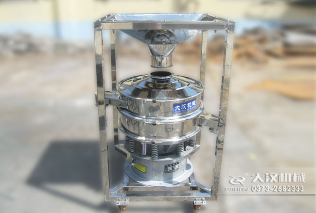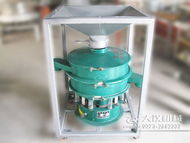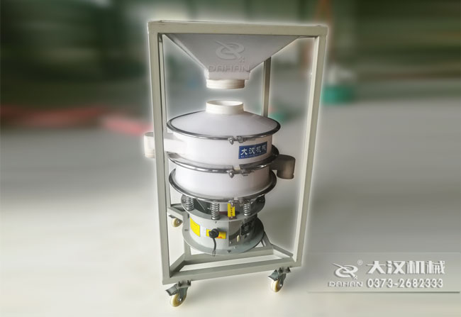 本品大漢公司研制的移動式料倉篩粉機,底部加裝可移動式萬向輪,帶進料倉,可將物料一次性裝滿料倉,然后通過調節料倉上的蝶閥控制物流進入振動篩的流量進行篩分,本品的特點間歇性加料,不用工人不間斷投料節省人工,蝶閥控制流量大小能提高篩分精度,同時可將振動篩移動作業,滿足不同地點的工作需要。