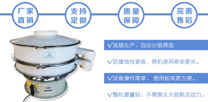 9、塑料振動篩與物料接觸部分采用的是PP塑料材質,是目前有效解決具有氧化、腐蝕鋼鐵材質的物料篩分、除雜、過濾的方案,并且確保了物料在篩分過程中不會變質。